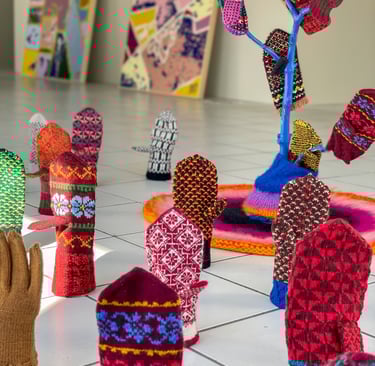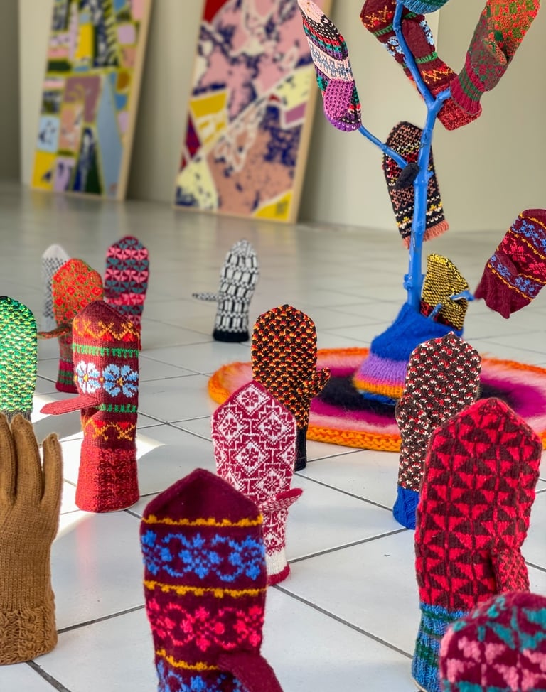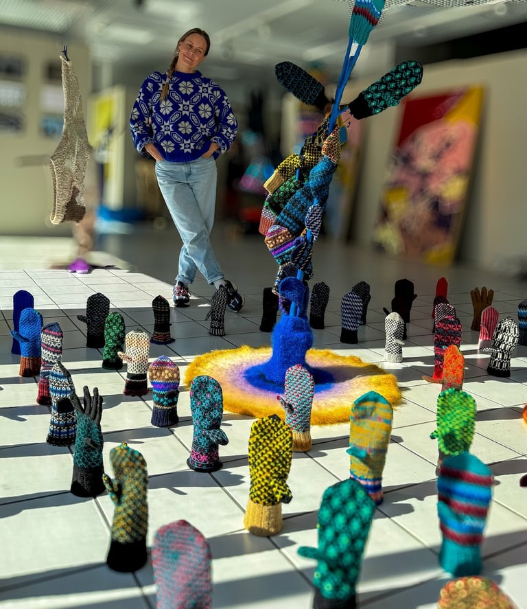 Handknitted mitten installation at Forssa Textile Week, Finland. August 2025.